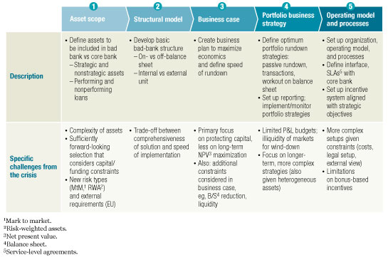 Consequently, institutions have developed several variations on the bad-bank theme to handle their particular sets of troubled assets and their available financial resources. These banks have made their choices, for better or worse, and are now working through a range of operational problems. Others, however, are still stuck at square one and are understandably perplexed by the range of possibilities and how the choice of a bad-bank model might affect their future. An analysis of bad banks set up in the crisis suggests that there are five sets of choices banks must make—choices about the assets to be transferred, the structure, the business case, the portfolio strategy, and the operating model. Each of these choices must be made while considering the impact on funding, capital relief, cost, feasibility, profits, and timing—a daunting array.