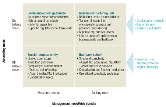Bad-bank spinoff. This is the most familiar model and also the most thorough and effective. In the spinoff, the bank shifts the assets off the balance sheet and into a legally separate banking entity. Such an external bad bank ensures maximum risk transfer, increases the bank’s strategic flexibility (for example, for potential M&A), and is a prerequisite for attracting outside investors. However, the complexity and cost of the bad-bank spinoff and its operation are very high because of the need for com-pletely separate organizational structures and IT systems and a doubling of the effort needed to comply with legal and regulatory requirements. There are further complexities surrounding asset valuation and transfer; funding for the bad bank may not be readily available, and there is no ready-made legal or accounting framework for asset transfer to bad-bank entities. For all these reasons, the bad-bank spinoff is a last resort, a step to be taken only after other measures prove insufficient in efficiently managing all toxic and nonstrategic assets. The challenges involved in a bad-bank spinoff will typically require that governments play a key role, especially in creating a common legal and regulatory framework and in supporting bad banks through funding or loss guarantees.