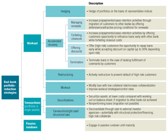 Passive rundown. The bank monitors the assets and acts only if risk rises above a predefined threshold. In today’s environment, given the high cost for transactions on illiquid and nonstrategic assets, this represents a “base case”—that is, the option that banks should choose unless they can see a compelling argument to pursue one of the more complex strategies. This is particularly true for bad banks built around structured credit assets that cannot be sold without incurring significant costs.
