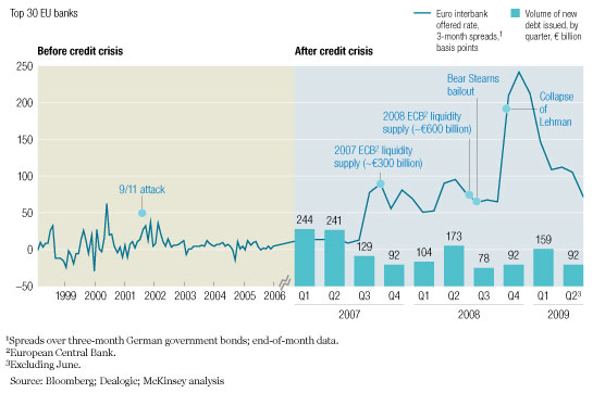 Two years on, the crisis continues to afflict most banks, particularly those with significant levels of illiquid and difficult-to-sell securities—the so-called toxic assets, and especially collateralized mortgage obligations (CMOs), collateralized debt obligations (CDOs), and collateralized loan obligations (CLOs). With these assets still on the balance sheet, banks are finding it difficult to raise funds from wholesale markets or capital from equity investors. Short-term funding spreads are slowly returning to precrisis levels, but they are still well above the levels seen in the early part of this decade—this despite the still-significant support (including quantitative easing, repurchase programs, loan guarantees, liberalized collateral requirements, and so on) from the central banks (Exhibit 1).