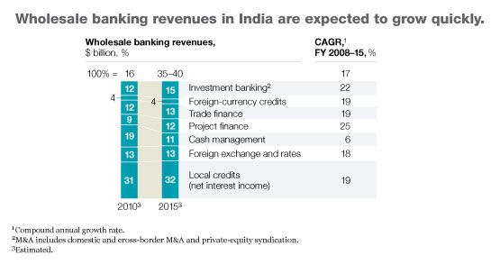 Wholesale banking in India is set for a period of sharp growth. Revenues from wholesale banking activities are likely to more than double over the next five years as infrastructure investment, expansion by Indian companies overseas, and further “Indianization” of multinational businesses, among other trends, drive new business. Foreign players and the country’s domestic banks, however, will find themselves in a tough commercial environment and must overcome a range of challenges if they are to maintain, or assume, a leading position in the market.