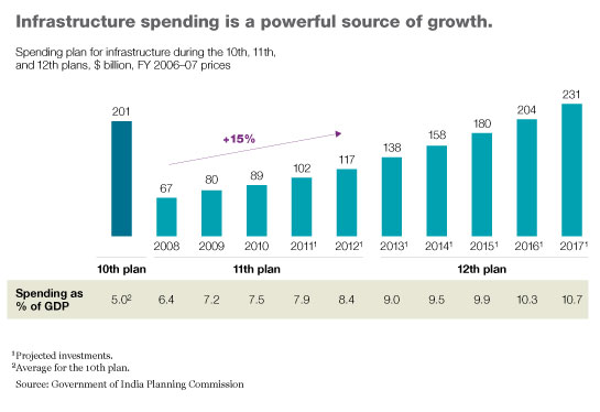 Investments in infrastructure totaling $240 billion between 2007 and 2010 have already been made under India’s 11th Five-Year Plan, and it is projected that investments under the plan will reach $500 billion, or roughly 8 percent of GDP, by the end of 2011. Demand for core infrastructure will nevertheless likely outstrip supply in the future. To sustain India’s economic growth, the Planning Commission therefore envisages that $1 trillion (about 10 percent of GDP) will be spent on infrastructure during the 12th plan from 2012 to 2017 (Exhibit 2).
