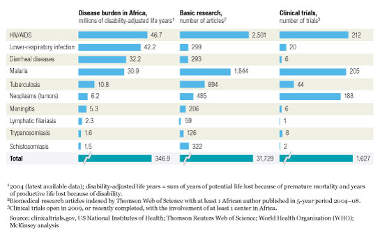 A favorable trend is emerging, though. An analysis of five years of biomedical-research articles originating in Africa shows that the number of articles on different diseases correlates well with their incidence in Africa.