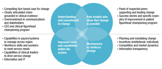 Developing a strong health system strategy is important, but executing it is what truly matters. We have found that four elements are critical to success: an understanding of and a commitment to change, role models to champion the effort, formal mechanisms to reinforce change, and skills and capabilities for improvement (Exhibit 5).