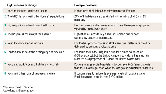 But a powerful case for change is not merely a well-crafted story; it must resonate with health care professionals, recognize their needs and concerns, and—most important—be underpinned by hard evidence. Clinicians will be dismissive of any approach that is not solidly grounded in facts. London’s case for change is based on established, well-respected sources of clinical data, such as peer-reviewed journal articles and independent reports by think tanks and regulators, and has been extensively tested and debated with clinicians (Exhibit 1).