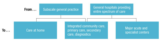 For most health systems, “decentralize where possible, centralize where necessary” would entail the creation of a primary and community care infrastructure that is able to deliver integrated services close to patients’ homes; consolidation of a relatively small number of centers that perform complex procedures (those for which there is compelling clinical evidence that greater specialization improves outcomes); and the development of a new model for high-volume, less-complex inpatient care. London described six settings of care, which have since attracted interest from other regions in the developed world. The six are medical centers (also called “polyclinics”), local hospitals, elective centers, major acute hospitals, specialist hospitals, and homes.