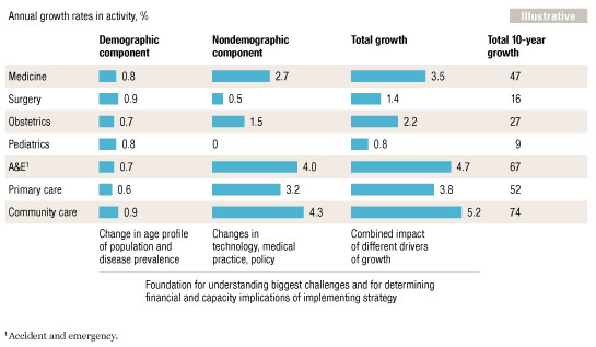 Popular belief holds that demographic and epidemiological factors, especially aging and the growing prevalence of chronic disease, are the primary drivers of demand for health system activity. We have found, however, that other factors—including changes in clinical practice, technology, the impact of health system and policy changes, and the public’s ever-rising expectations of health care—are also significant determinants of demand growth (Exhibit 2). For example, the rapid growth in cardiology throughout the developed world is driven more by angioplasty and other technological advances in care than by changes in the prevalence of heart disease. System and policy changes can have a significant impact on demand as well. In England, there has been an increase in emergency-room visits due to a combination of two factors: greatly reduced waiting times and a decline in the number of primary care practitioners providing care outside routine office hours.