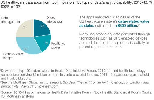 To understand the potential of “big data,” look no further than the US healthcare sector. Information silos between payers and providers are crumbling, enabling the powerful integration of digitized public historical and real-time data. We recently glimpsed the future when we integrated two unique data sets: a sample of software applications submitted to the federal government’s Health Data Initiative Forum in 2010 and 2011 and the roster of software applications with venture-capital backing of at least $2 million in 2011 or 2012. About 40 percent of those data applications were aimed at direct health interventions or predictive capabilities. That’s a powerful new frontier for health-data applications, which historically focused more on data management and retrospective insights (exhibit).