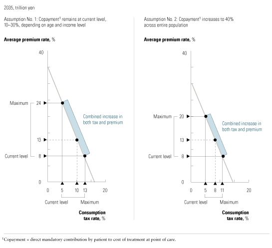 If, for example, Japan increased government subsidies to cover the projected growth in health care spending by raising the consumption tax (which is currently under discussion), it would need to raise the tax to 13 percent by 2035. But the country went into a deep recession in 1997, when the consumption tax went up to the current 5 percent, from 3 percent. Similarly, a large spike in insurance premiums would increase Japan’s labor costs and damage its competitive position. Markedly higher copayment rates would undermine the concept of health insurance, as rates today are already at 30 percent.