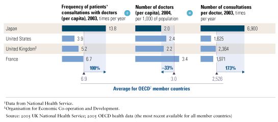 The country’s health system inadvertently promotes overutilization in several ways. For starters, there is evidence that physicians and hospitals compensate for reduced reimbursement rates by providing more services, which they can do because the fee-for-service system doesn’t limit the supply of care comprehensively. Japan’s physicians, for example, conduct almost three times as many consultations a year as their colleagues in other developed countries do (Exhibit 3).