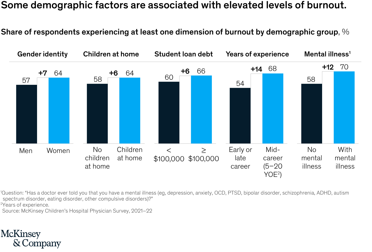 - A majority (70 percent) of surveyed pediatricians with a diagnosed mental illness said they are experiencing at least one dimension of burnout. They were also twice as likely to say they intend to leave their position in the next year compared with pediatricians without a mental illness, at 30 percent and 15 percent, respectively (Exhibit 3).