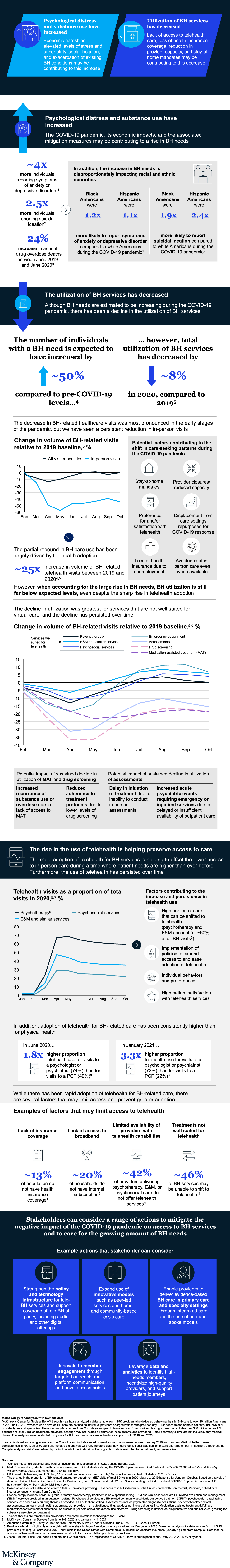 In order to understand the impact of COVID-19 on the use of behavioral health services, McKinsey’s Center for Societal Benefit through Healthcare analyzed a claims data sample from 115,000 healthcare providers who delivered behavioral healthcare to more than 20 million Americans in 2019, 2020, and 2021. Since the onset of the COVID-19 pandemic, psychological distress and substance use have reached new levels in the United States. While there has been a decline in the use of behavioral health services as measured by healthcare claims, the rise of telehealth has helped maintain access to care during the pandemic. There has also been growth in behavioral health services not covered by insurance (and thus not captured by claims) such as EAP counseling, digital platforms to connect, and virtual coaching.