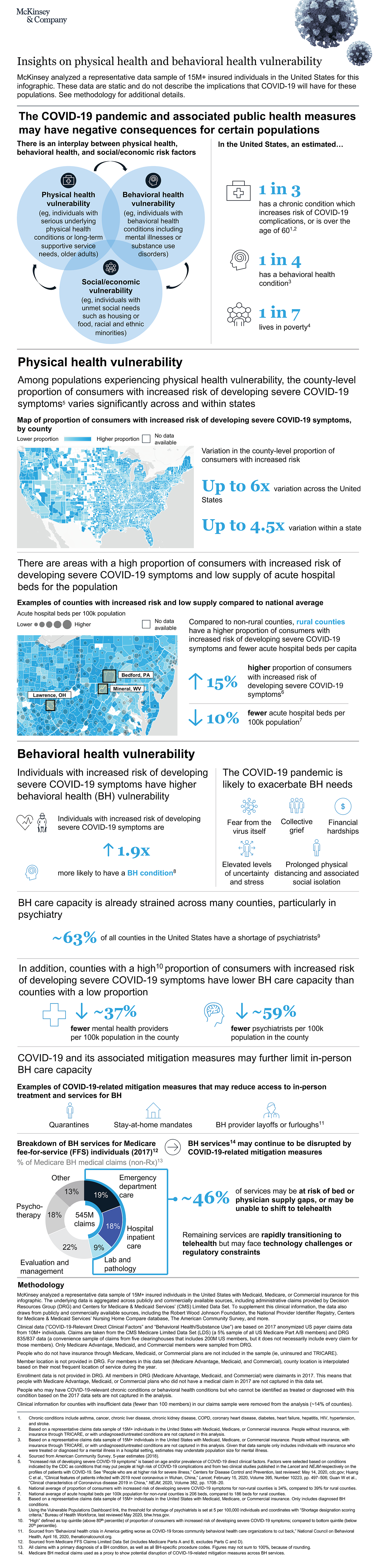 COVID-19 and associated public health measures may negatively affect some individuals with physical health, behavioral health (mental health and substance use disorders), and social and economic vulnerability. To better understand the potential impact on these populations, McKinsey developed an open-access dashboard incorporating a clinical data sample of more than 15 million insured individuals in the United States as well as non-clinical data elements.