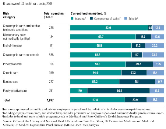 To better inform the debate on the health care system, we offer a new way to look at the distribution of costs within it. We break down the country’s health care spending into separate risk categories, map them to specific medical conditions by their unique characteristics, and identify who pays for what (see sidebar “About the research”).