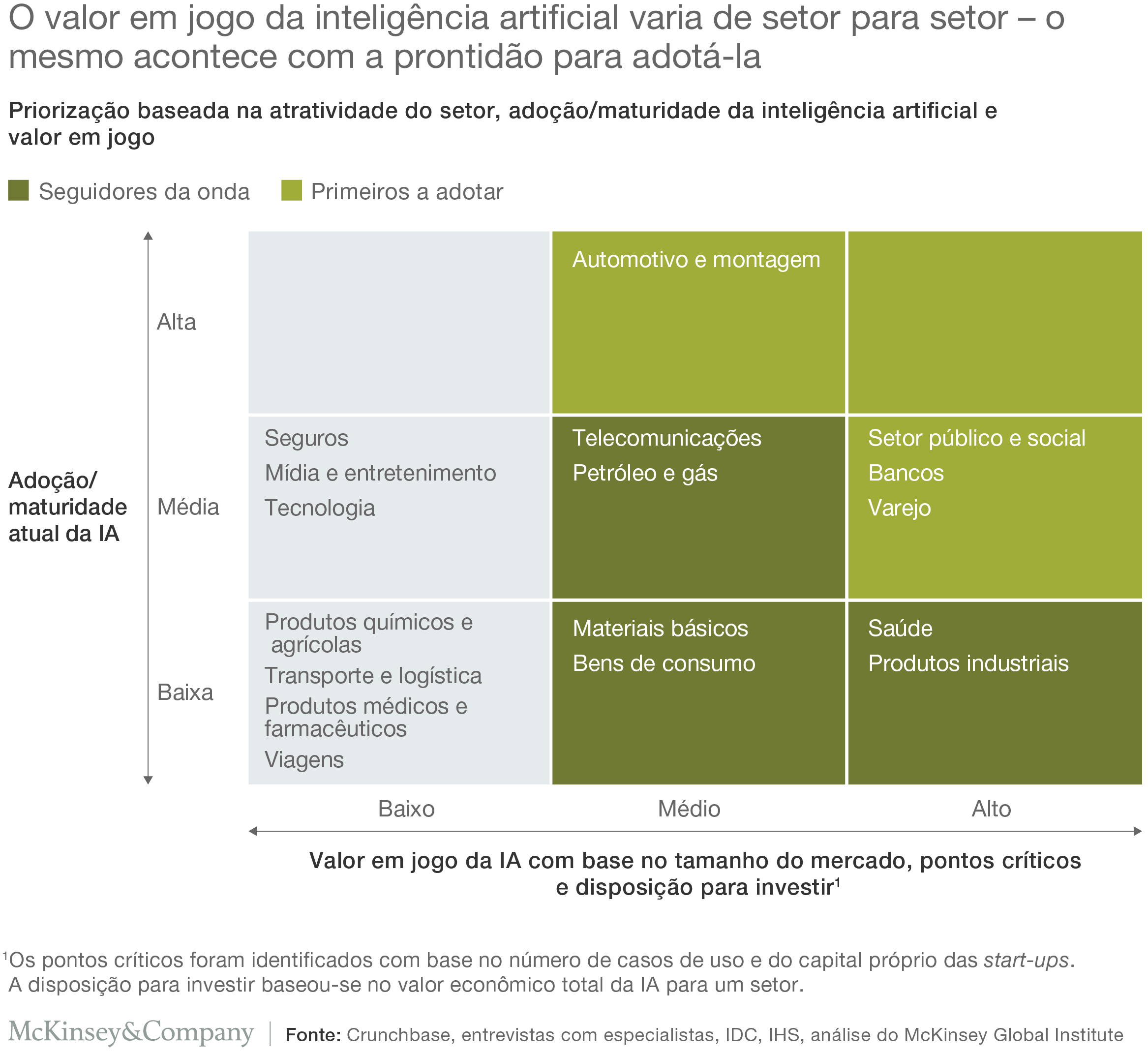 Assim como o valor da IA varia conforme o setor, o mesmo acontece com sua maturidade. Por exemplo, o setor industrial poderia ganhar muito com a IA, mas as empresas que nele atuam estão menos preparadas para adotar tais soluções do que suas pares do setor automotivo. Para fornecedores de produtos e serviços de IA, isso significa que a captura de valor será escalonada, com alguns setores proporcionando inicialmente retornos mais elevados que outros.