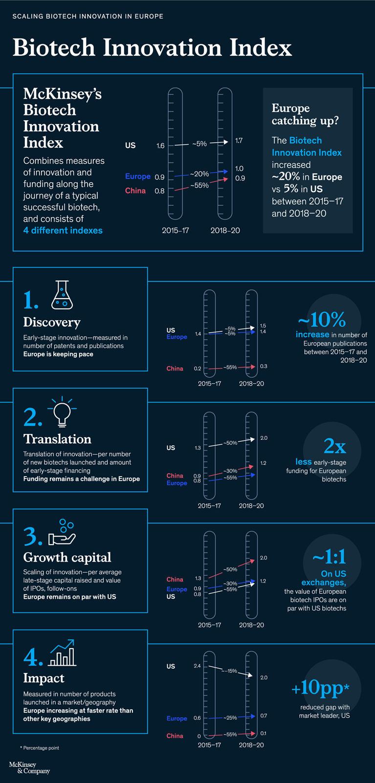 McKinsey’s Biotech Innovation Index assesses innovation and funding in terms of four indicators: discovery (measured in numbers of patents and publications); translation (measured in numbers of new biotech companies and average amounts raised in early-stage financing); growth capital (measured in average amounts raised during late-stage funding and by IPOs and follow-on offerings on public markets); and impact (measured in numbers of products launched).