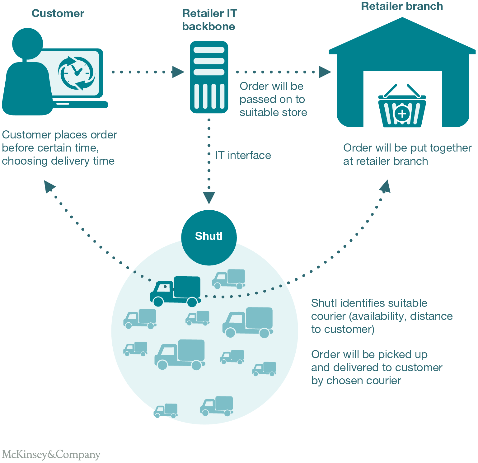 Example: Shutl has managed to dimension its platform so as to achieve significant scale in the UK. It is quoted as handling 30,000 shipments per day. The company claims to cover most urbanized areas (85 percent of the UK population). The broker platform closes the gap between existing but fragmented courier capacity and UK retailers. “We are faster and we augment existing services with features customers are craving for, such as evening delivery or delivery in a defined time-slot.”  (Gregor Melhorn, CTO, Shutl) Most of its retail partners are consumer electronics or fashion retailers with relatively high average basket sizes. The company has already won Argos, one of the largest multichannel retailers in the UK, as a retail partner. As part of eBay, Shutl will further drive eBay’s same-day delivery efforts in the US, piloted in the project eBay Now. Up to now Shutl has operated as an independent distribution channel without its own retail operations, and has therefore had the advantage of avoiding channel conflicts such as Amazon creates by simultaneously acting as both marketplace and retailer. The downside for retailers is the absence of enforced quality standards and guaranteed delivery (such as when incoming demand peaks around Christmas time). The more retailers integrate with the platform, the higher the liquidity for couriers, bringing significant network effects into play. The more liquidity the platform bundles, the better couriers can balance the demand variability of their B2B shipment volumes and optimize their capacity utilization. To achieve this, the platform integrates with the transportation management systems of the couriers, allowing them to optimize their routes. Small courier companies can scale their capacity relatively fast, and have lower variable costs than larger logistics companies. This has allowed Shutl’s flexible courier network to grow significantly. The company is now expanding into the US, which is even more urbanized and equally e-commerce-savvy.