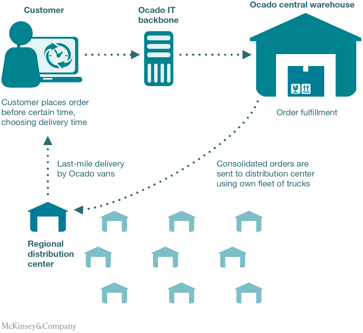 Example: Ocado runs its own last-mile operations. The online grocery retailer has control over its entire logistics process, ensuring the highest level of convenience for its customers. Orders are fulfilled in a central warehouse and distributed in branded vans from ten regional distribution centers. Same-day delivery is currently only available in selected areas, as the limited shipment volume per geographic unit and reliance upon the central warehouse does not permit broad service coverage.