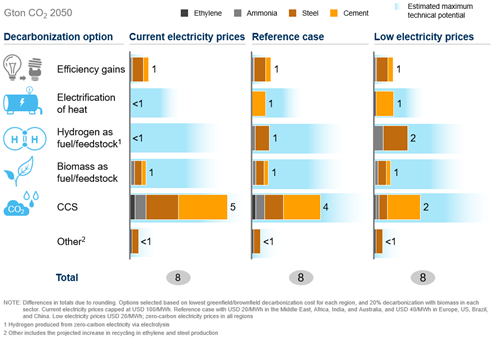 - At electricity prices below ~$25/MWh, electrification of heat in greenfield ethylene production and in brownfield cement production and usage of hydrogen for brownfield steel production are more cost-competitive than applying CCS to conventional production processes.