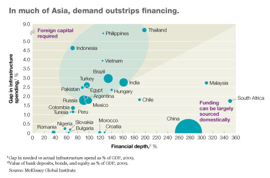 Several countries, such as China and Malaysia, have sufficient financial depth in their domestic private-capital markets to meet their infrastructure funding requirements (Exhibit 2). Foreign investors should therefore focus on countries such as India, Indonesia, Thailand, Vietnam, and the Philippines, where the financial markets have less capacity.