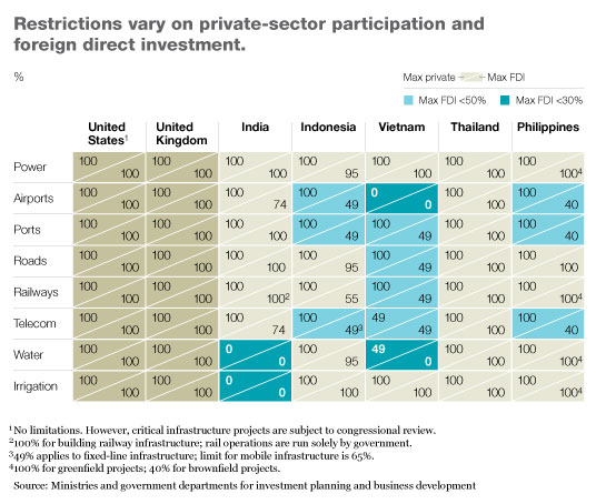 Although the environment is changing, even in these countries the bulk of infrastructure investments will likely remain effectively closed to private investment. The obstacles are varied. Many governments, for instance, have ill-defined PPP policies that, because of their vagueness, inhibit private participation, while capital controls frequently deter investors who worry that they may not be able to repatriate their cash flow. Weak regulatory or legal systems intensify the risk, and while shallow or illiquid capital markets make private investment necessary, they also complicate exit strategies. Exhibit 3 calculates the effect of restrictions on foreign direct investment in India, Indonesia, the Philippines, Thailand, and Vietnam.