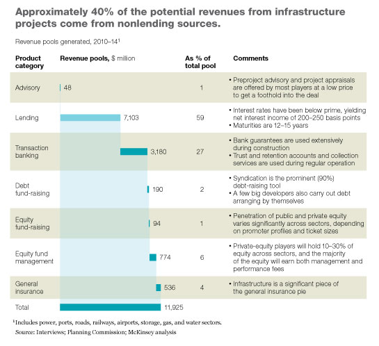 In recent years, savvy financial institutions with a well-rounded suite of financial services have begun adopting integrated models for infrastructure investment. For example, besides funding the construction of an airport, an integrated player might also offer transaction banking services and insurance to the airport operator. Such cross-selling can deliver significant value, as our research suggests an estimated 40 percent of potential revenues from infrastructure projects come from nonlending sources (Exhibit 5). Even better, this extra value opportunity comes with relatively little additional risk—after all, the operation of an airport, or indeed a power plant, once up and running, is relatively straightforward compared with getting it built in the first place.