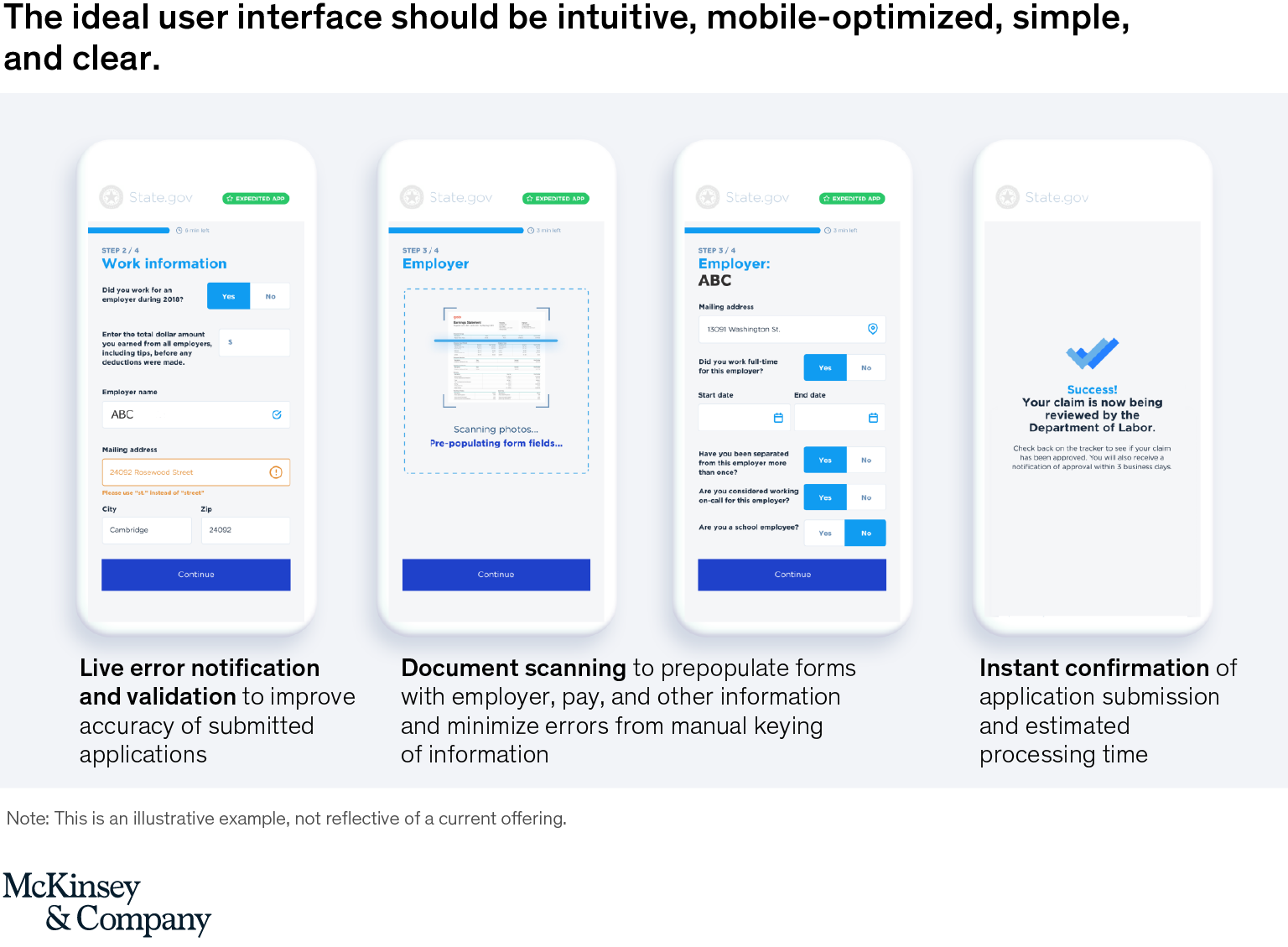 Digitize enables states to make significant front- and back-end changes to improve user interaction, enhance data clarity, and streamline workflows—ushering in a completely reinvented process, which is especially relevant given the implications of physical distancing during a pandemic. At the same time, a cloud-hosted model increases the ability to handle surge volumes more easily, web pages updated with simple directions and FAQs improve application quality, optical character recognition scans forms rapidly and automatically, and dashboards track productivity in real time (Exhibit 3). State unemployment program leaders will need to work closely with state or department chief information officers to incorporate considerations such as security and coordinate on procurements, but this lever has significant potential to support physical-distancing efforts by enabling both residents and state employees to avoid physical locations.