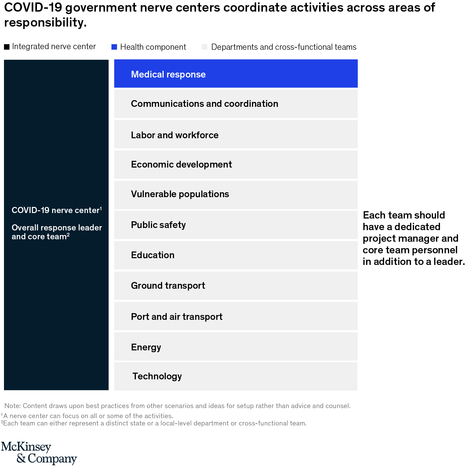 Our experience suggests that a crisis nerve center—a highly agile, coordinated body that brings together crucial organizational skills and capabilities—can provide senior government leaders with the structure and clarity to mount an effective response and mobilize every part of society.