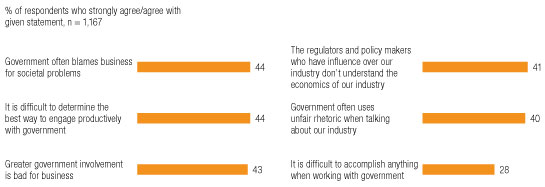 Given this value at risk, it’s heartening that 71 percent of respondents say companies should proactively and regularly engage with government. But it’s less encouraging that only 43 percent say their companies actually do so.