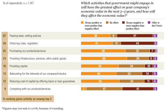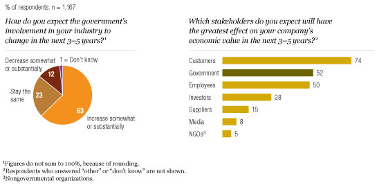 Government is likelier to affect companies’ economic value than any other group of stakeholders except customers, say executives in response to a new McKinsey survey.1 The results also indicate that most executives expect government involvement in their industries—which in most cases has skyrocketed since the global economic crisis began—to continue increasing. The survey asked executives about their companies’ relationships with the government of the country or region that is their primary market: how government affects their companies’ economic value, how their companies interact with the government, how effective those activities are, and who spearheads the companies’ relationships with the government.