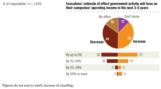 Respondents are nearly evenly divided on whether government actions will increase or decrease the operating incomes of their companies over the next three to five years (Exhibit 4). Yet 34 percent of respondents say the effect, whether positive or negative, will be 10 percent or higher; thus, significant value is at stake for many companies.