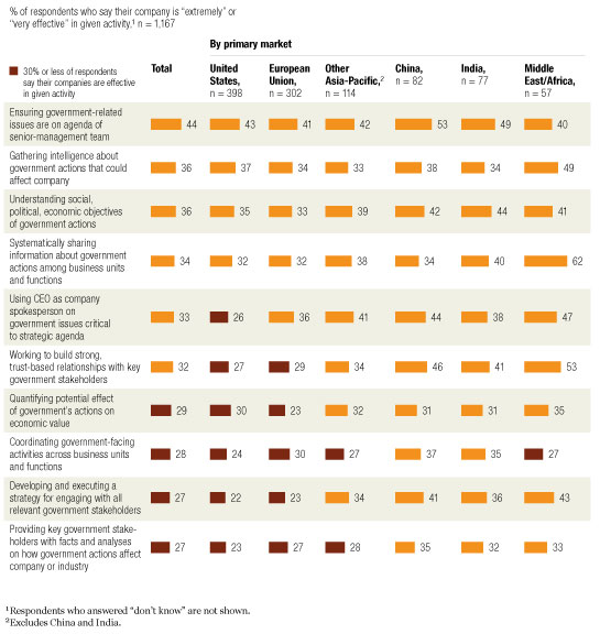 When companies do engage with government, executives indicate they’re not particularly good at it. Engaging with the governments of their companies’ primary-market countries is a top-three priority for only a third of CEOs—although the figure rises to nearly 60 percent in China. More are involved in overseeing their companies’ efforts to engage: almost two-thirds of respondents say their CEOs either sponsor those efforts personally or oversee the group that does so.
