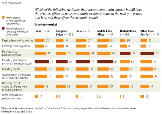 A variety of government actions affect companies’ economic value; not surprising, respondents in every country select passing laws and enforcing regulations far more often than other actions as having an effect (Exhibit 2). Although most government actions are less likely to have an effect than those two, others are seen as likelier to have a positive than a negative effect on companies’ finances. There are notable regional differences in the government actions executives say are likeliest to have a positive effect—mostly related, it appears, to a greater need for infrastructure and capital in developing economies (Exhibit 3).