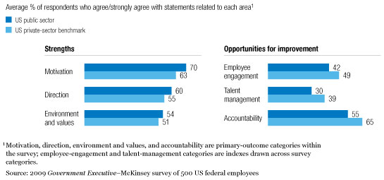 McKinsey, in partnership with Government Executive magazine, recently surveyed more than 500 federal employees from dozens of agencies to provide input for government leaders seeking to strengthen performance. The survey measured the elements that contribute most to organizational performance and also compared the results to private-sector benchmarks.1 Among the elements measured were the following: