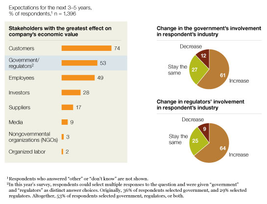 Just over half of respondents say governments and regulators will be among the stakeholders with the biggest economic impact on their companies over the next three to five years, and even larger shares expect governments’ and regulators’ involvement in their industries to increase in the same period (Exhibit 1). These results are consistent with those in the previous survey, in which 52 percent of respondents said governments would have the greatest effect on their companies’ value,4 and 63 percent expected increased government involvement. This consistency surfaced in spite of recent events—such as the 2010 electoral success of the Republican Party in the United States and the Conservative Party in the United Kingdom—that might have caused business leaders to expect less government activity. Executives in developing markets are the likeliest to say governments will have an effect on economic value, with two-thirds of them saying so.5