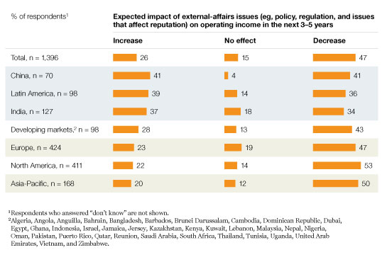 When we asked about the impact of governmental and regulatory actions and other external-affairs issues on operating income, we saw responses that were similar to, but more pronounced than, responses to our last survey, which asked about government actions alone. Forty-seven percent of respondents to this survey say their companies’ operating incomes are likely to decrease because of external-affairs issues (Exhibit 2), while 34 percent said the same about government activity in 2009. This year, about a quarter of respondents say these issues are likely to boost their companies’ operating incomes, compared with 38 percent who previously said the same. As in the prior survey, executives in developing economies such as China and India are more optimistic.