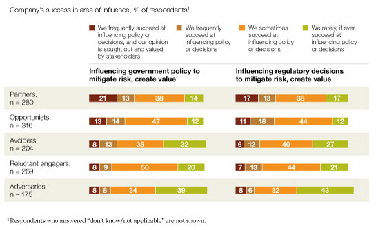 Not surprising, respondents classified as either partners or opportunists say their companies are more successful at influencing government policies and regulatory decisions to create value or mitigate risk than those in other groups—though overall, the shares of total respondents who say their companies have the most collaborative relationships with stakeholders remain low (Exhibit 5).