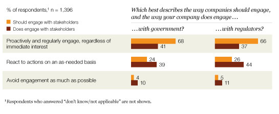 Two-thirds of executives say companies in their industries should engage with governments and regulators proactively and regularly, regardless of immediate interest, but less than half say their companies actually do (Exhibit 4). This contrast is almost identical to the one we uncovered in our prior survey, when 71 percent of executives said their companies should engage proactively and regularly, but only 43 percent reported doing so. We would have expected to see an increase in proactive, regular engagement since last year, given this year’s expectations for growing external involvement.