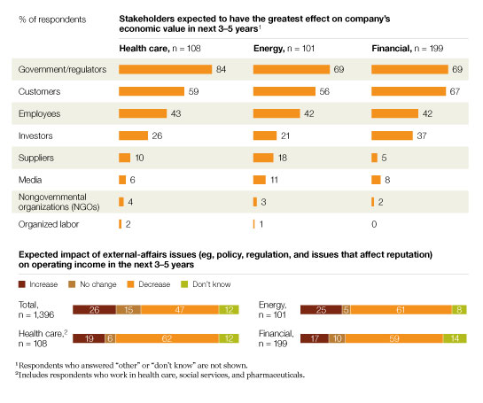 Consistent with past results (and with the overall conditions in these industries), executives in energy, financial services, and health care are the only ones to rank governments and regulators as the stakeholders most critical to their companies’ economic value, even more significant than customers.6 Most respondents from these three industries also say operating income is likely to decrease as a result of external-affairs issues (Exhibit 3). Around three-quarters of respondents in each of these industries expect greater government involvement, and it’s also worth noting that more than 80 percent of financial-services and health care executives expect greater regulatory involvement—a signal that these industries recognize that government is here to stay.