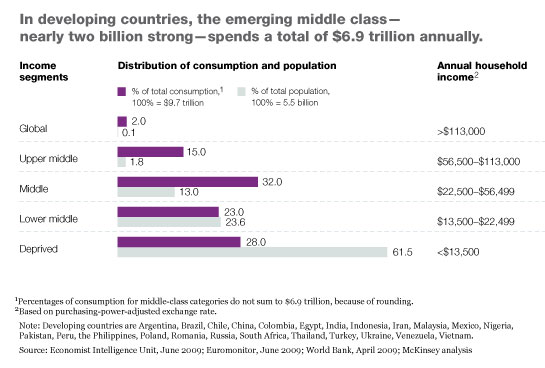 The rapidly growing ranks of middle-class consumers span a dozen emerging nations, not just the fast-growing BRIC countries,1 and include almost two billion people, spending a total of $6.9 trillion annually. Our research suggests that this figure will rise to $20 trillion during the next decade—about twice the current consumption in the United States (Exhibit 1).