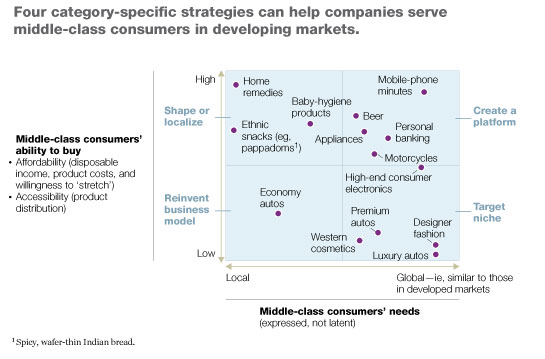 The first category, at the top right of the matrix, comprises products and services for which consumer needs are quite similar across geographies and affordability is not a constraint. There is little need to create marketing plans to roll out such products in different countries, one after another: we’ve found that it’s most efficient to identify similar consumer segments across countries and to build scalable business models for each cluster. Examples of products in this category include personal banking, mobile communications, consumer electronics, and pharmaceuticals, which have similar industry structures, rates of consumer adoption, and socioreligious factors across geographies.
