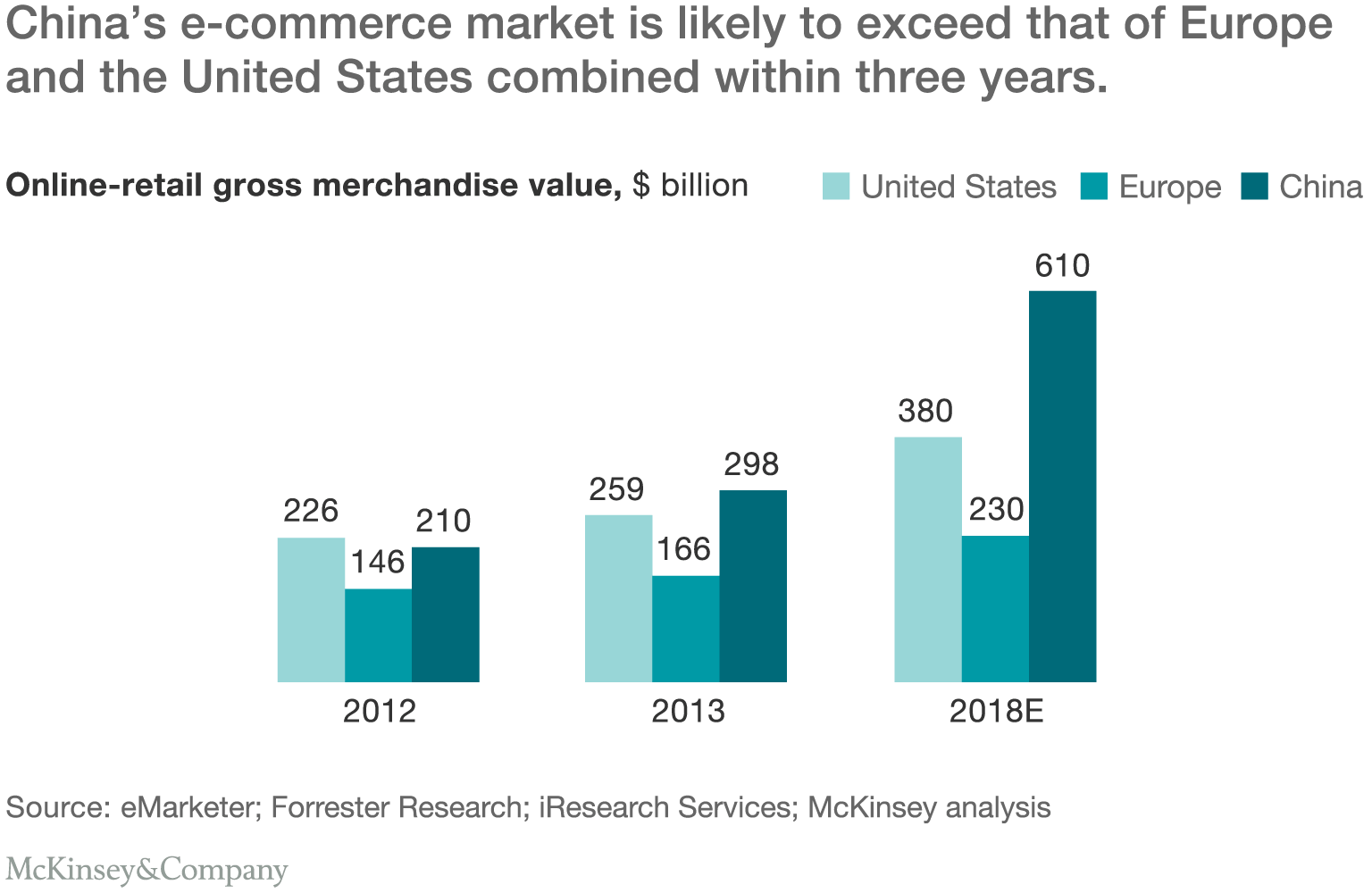 China’s annual online-retail sales passed those of the United States in 2013. By 2018, they are estimated to reach about $610 billion—passing Europe and the United States combined (exhibit). Yet though the market is vast, succeeding in China is far from easy. While select leading Western companies have captured some of the country’s explosive e-commerce growth, many make basic mistakes, from equating China’s e-commerce leaders with US companies (“Alibaba is China’s Amazon!”) to assuming selling and distribution practices from home markets are transferable. The reality is that China is simply different. As a point of comparison for consumer and retail companies, we regard the combination of the size of the prize and the degree of change needed to succeed as roughly analogous to what consumer-packaged-goods companies experienced in the late 1980s when Walmart changed the consumer game.