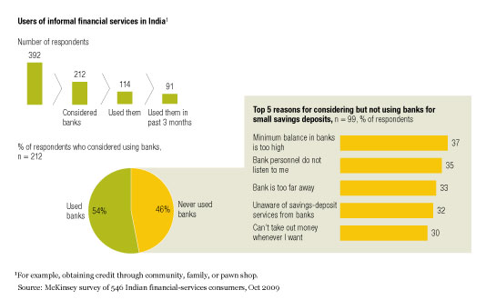 In general, the unbanked—even the lowest-income segments—actively use informal financial services. Without access to traditional banks, many turn to their families or communities or to pawn shops when they need credit. Nearly 90 percent store money at home, with a household member, a friend, or a village savings club. Some buy assets, such as cows or chickens, as a store of value. These informal channels tend to be unreliable and expensive.