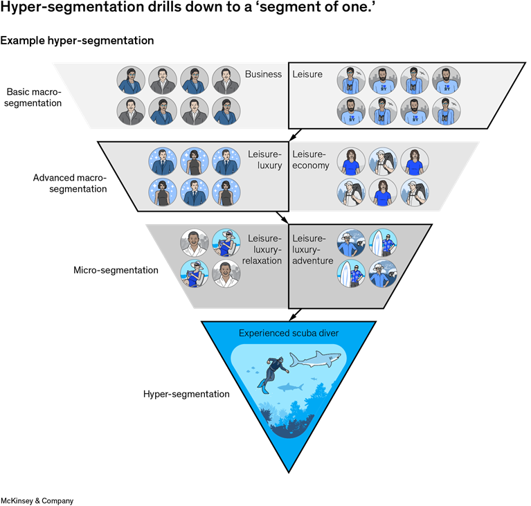 Having gained a clear and comprehensive understanding, companies can create customer segments to guide how they interact with and serve different customers. Depending on the data available and the analytics capabilities at hand, segmentation can range from grouping customers into segments based on a single macro characteristic (e.g., business versus leisure) to individual “segments of one,” known as hyper-segmentation.