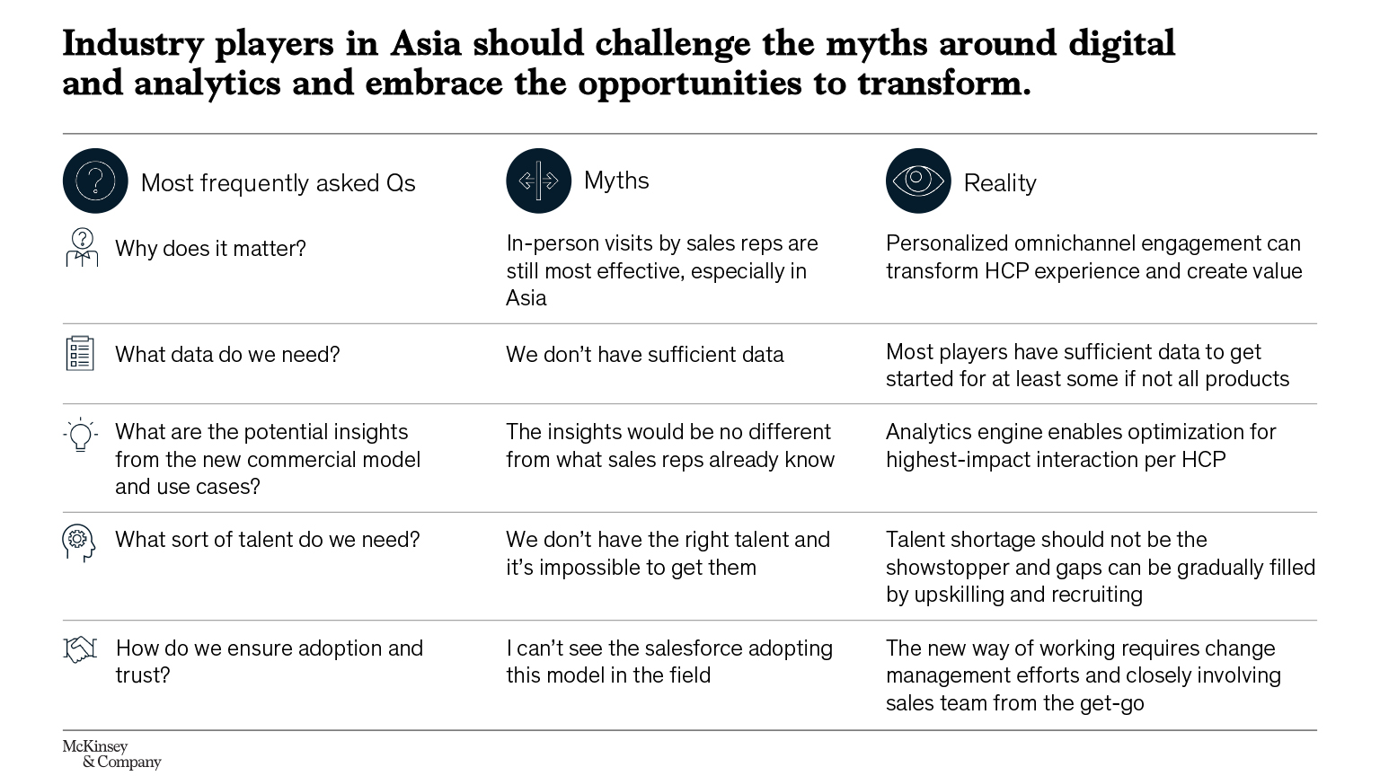 Additionally, there are numerous misconceptions around digital, analytics, and omnichannel. Many industry players remain unconvinced by the urgency of the situation and are unsure of the feasibility and impact of applying digital and analytics in transforming their commercial model. Indeed, from our discussions with pharma leaders in Asia, we commonly hear five key questions asked in relation to adopting an analytics-enabled omnichannel commercial model (Exhibit 1):