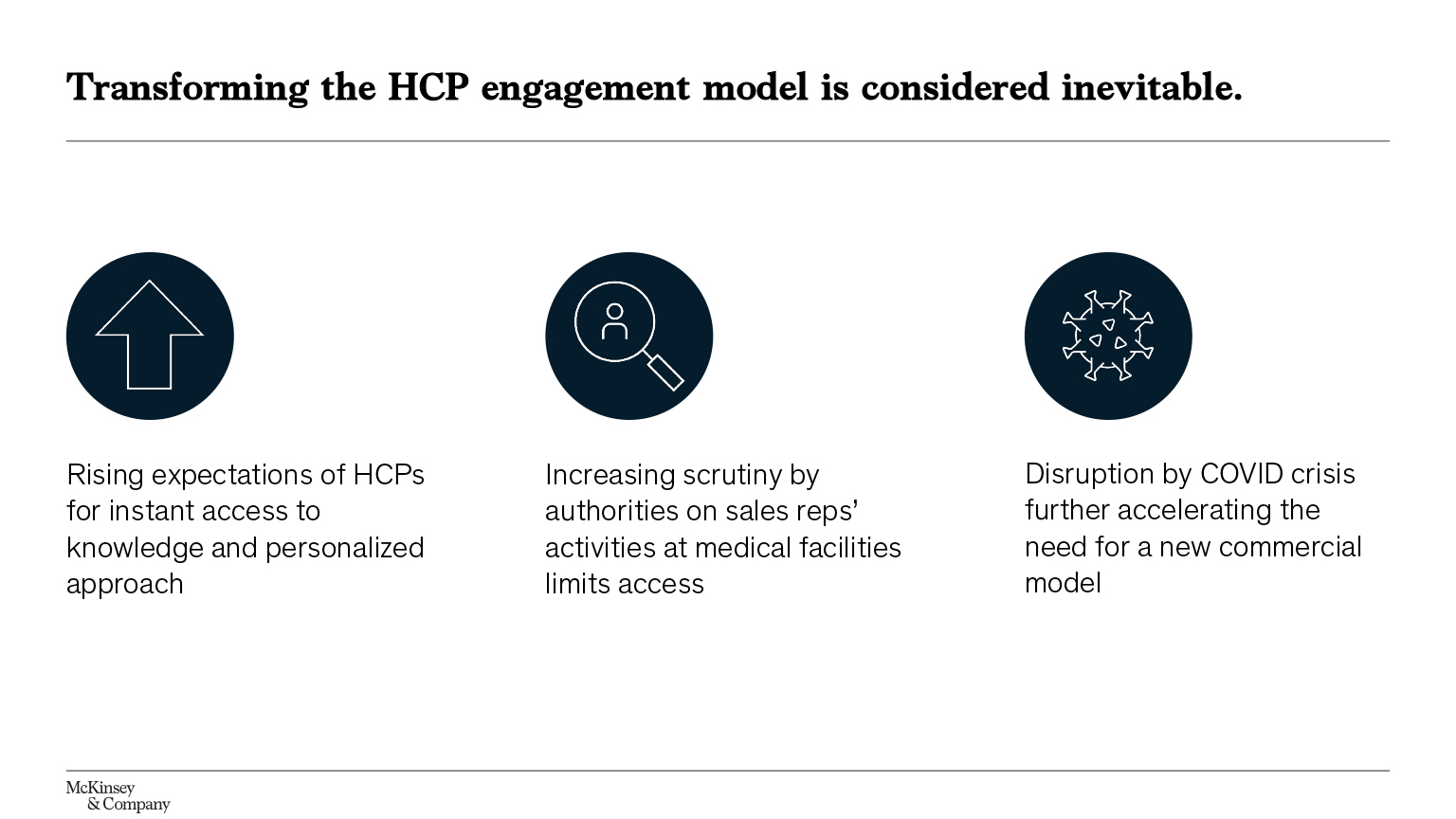 Simultaneously, conventional face-to-face visits to HCPs have reached the limit of their effectiveness: investing in more face-to-face visits is costly and may not effectively contribute to disease awareness or more appropriate product use for the right patients. In response, pharma company players around the world have started to develop a vision to transform their HCP-interaction models via digital and advanced analytics and many have developed initial solutions for select products in priority markets. Recently, the COVID-19 pandemic has provided further impetus for companies to transform their commercial models.