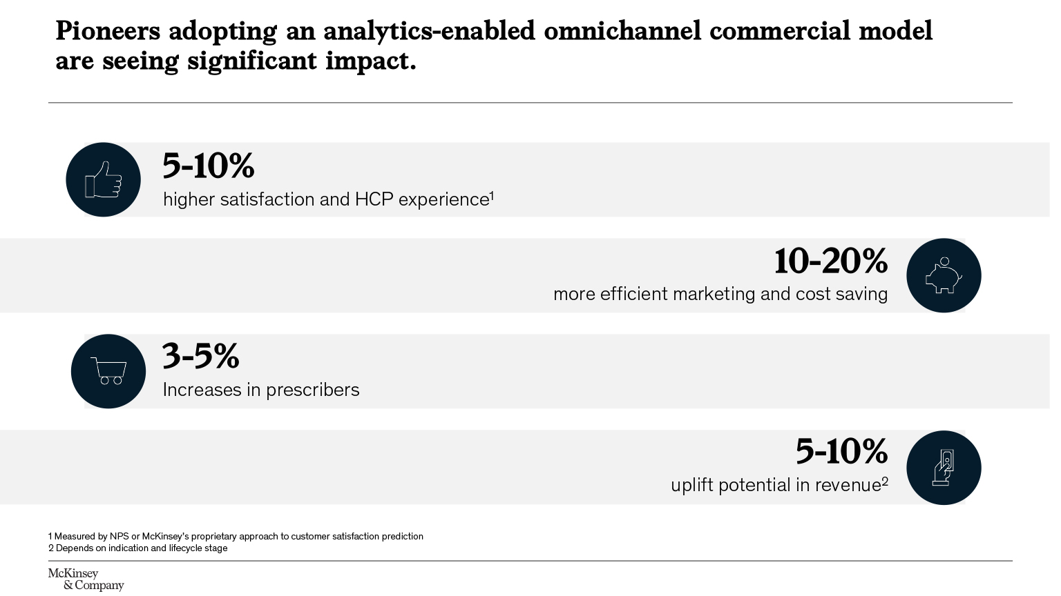 Pioneers that have adopted analytics and omnichannel approaches as part of their commercial model have garnered significant rewards. Globally, we have observed that, when implemented well, commercial transformations can create 5–10 percent revenue uplift, a 10–20 percent increase in marketing efficiencies and cost savings, a 3–5 percent increase in prescribers, and 5–10 percent higher HCP satisfaction (Exhibit 3). These improvements are driven by the differentiated insights enabled by advanced-analytics that help guide commercial activities: examples include the creation of personalized messages and channels for individual HCPs, and the allocation of resources for greatest impact. The omnichannel commercial model would fundamentally upgrade ways of working, including skills adapted for a more tech-enabled world. HCP experience would also be transformed as personalized engagement would lead to more meaningful interactions. Importantly, continuous iteration with feedback from the market strengthens the predictive and optimization power of the analytics system.