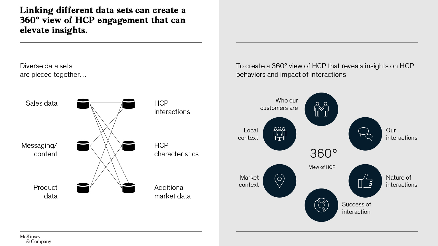 Most industry players have already started accumulating product data, HCP characteristics, details of HCP interactions, content, sales data, and market-context data (including demographics and information on the competitive landscape) via their CRM system, market-research surveys, and through third parties. In the development of an analytics-enabled omnichannel commercial model, these very same datasets can be sourced and linked to form a 360-degree view of HCPs such as who and where they are, their market context, how the company has been interacting with them, and how successful these interactions have been. (Exhibit 4). Analyzing such data allows the company to derive insights and define what are most impactful touch points with individual HCPs in determining their prescribing preferences and ensuring the right treatments reach the right patients at the right time. These insights can in turn drive improvements in HCP prioritization, channel mix, product positioning and messaging specific to individual HCPs.