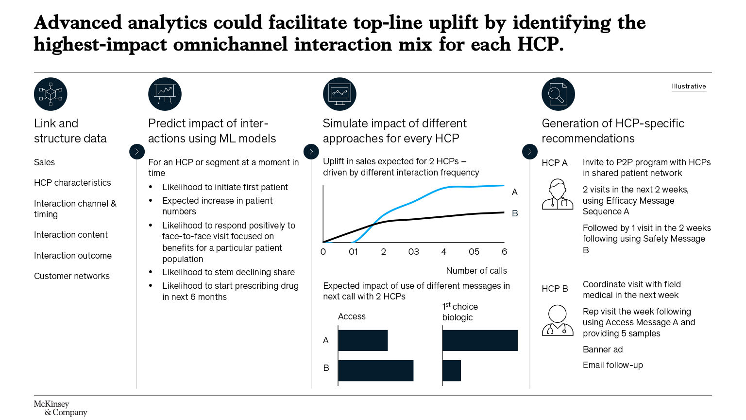 1. Descriptive/explanatory analyses of markets—answering what has happened in the past, and why. Specifically, mining historical data with advanced analytics can enable micro-segmentation of HCPs across channels (versus conventional survey-based attitudinal and demographic segmentation). This allows a deeper understanding of HCPs and their journeys and guides personalization of content and messages that can help HCPs serve their patients better.