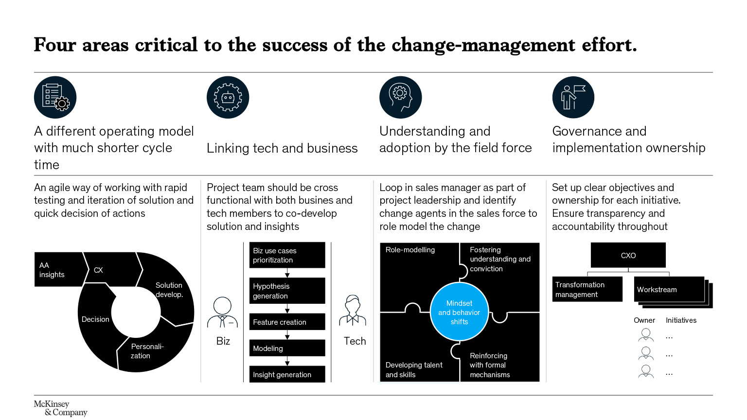 Upon completing development of analytics for its flagship products (using various datasets of product data, interaction data, and third-party data in a select Asia Pacific market), a multinational pharma company initiated transformation of its sales organization to adopt the new way of working. A transformation office was set up to orchestrate communication from top management to line managers and the front line. Initiatives to upgrade process, operating model, organizational structure, and governance for the new way of working were developed and implemented with disciplined cadence and rigor. This was perceived by top management as an essential step to institutionalize the capabilities and mindset for the new commercial model after the considerable efforts to develop the underlying analytics function.